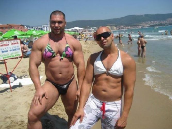 Muscular guys are often seen at the beach, so encountering them there isn’t unusual. However, on this particular day, they wore something quite interesting. They might have lost a bet if they did this, but if they didn’t, maybe they wore it because they found it amusing. If the latter was true, then what they said was indeed fitting.